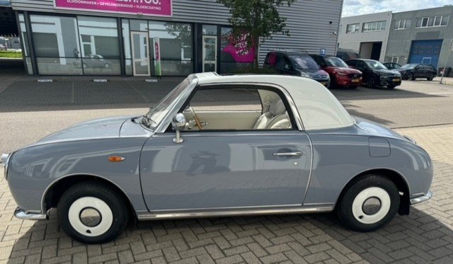 Hele mooie Nissan Figaro die net, vanwege krasjes en deukjes na 34 jaar gebruik, een verse laklaag aan de buitenkant heeft gekregen.